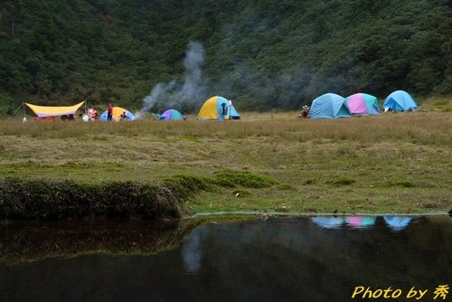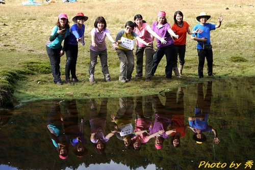姐妹們多年來的夢想,17歲的夢幻少女湖「松蘿湖」,托 巨足的福今日終於得以一償宿願。松蘿湖〈約H 1230M 〉位於新北市烏來鄉與宜蘭縣大同鄉的交界,雪山山脈北邊 ,南勢溪上游,因四週群山環抱,常年雲霧籠罩,宛若十七 歲少女般嬌羞含蓄,故有「十七歲之湖」的美稱。十七歲之湖–松蘿湖